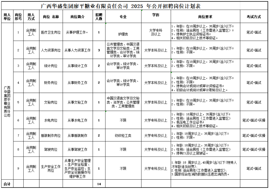 2025年拟面向社会公开招聘合同制工人14人(月薪4000—7000元)。其中:医疗卫生岗位1人、人力资源岗位3人、统计岗位2人、财务岗位2人、文秘岗位1人、生产安全工作岗位1人、水电岗位1人、服装制作岗位2人、驾驶岗位1人。岗位需求详见附件:《广西华盛集团廖平糖业有限责任公司2025 年公开招聘岗位计划表》。