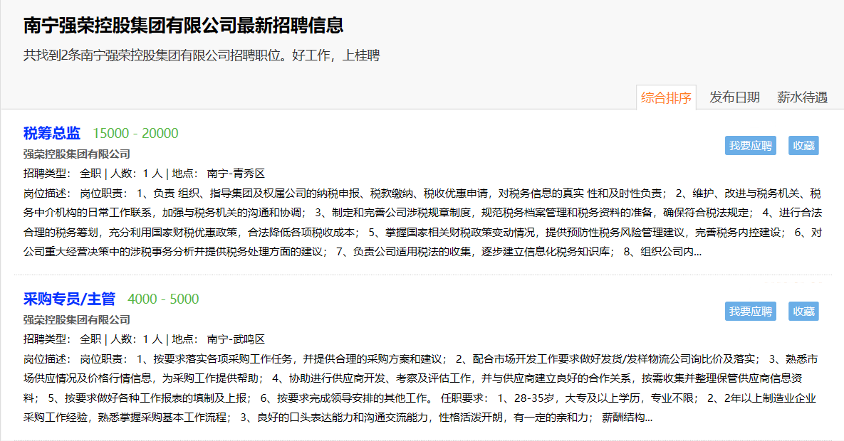 以上就是强荣控股集团的相关信息,如果你想深入了解或者想了解南宁其他公司相关信息的话,可以下载桂聘APP,走哪都方便找工作!如果你觉得文章不错,可以分享给身边正在找工作的小伙伴们哦~相信你们一定可以找到一份心仪的工作的!