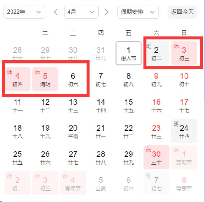 根据《国务院办公厅关于2022年部分节假日安排的通知》(国办发明电〔2021〕11号)精神,2022年清明节放假时间为4月3日至5日。农历三月初三为4月3日(星期日),与清明节放假时间重叠。为营造我区“壮族三月三”良好节日气氛, 本自治区内4月2日(星期六)、6日(星期三)放假调休,即“壮族三月三”和清明节放假时间为4月2日至4月6日。